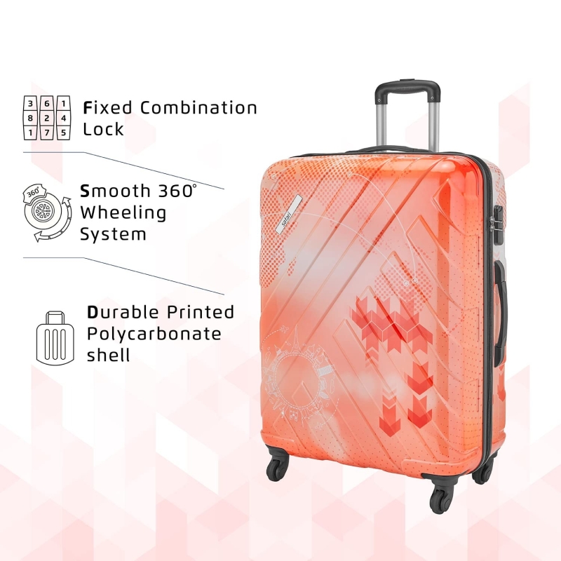 FEATURES : Number of Wheels - 4, Number Lock, No of Compartments -2, Adjustable Trolley, Hard Case Printed Design Trolley
