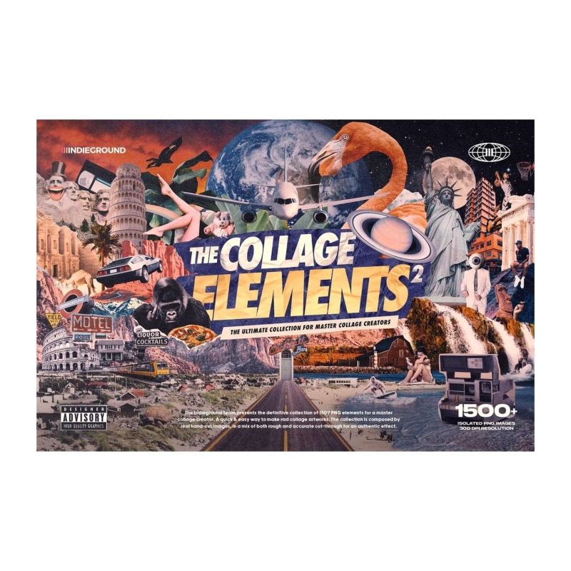The Collage Elements PNG Collection by Indieground This amazing product made by the Indieground Team is the definitive collection of 1509 elements for a master collage creator. It gives you a quick & easy graphic resource that you can use to make rad collage artwork. The collection is composed of real hand-cut images, in a mix of both rough and accurate cut-through for an authentic effect. The images were researched & found through vintage magazines, postcards, books, and digital printed material, scanned at 1600 dpi, and then individually isolated and exported as 300 dpi PNGs with a transparent background. The result is an incredible collection of authentic-looking cutouts easy to use and perfect for your creative projects such as posters, art prints, vintage artworks, apparel design, Instagram and other social media posts or stories, and much more, with a cool retro mood & aesthetics.