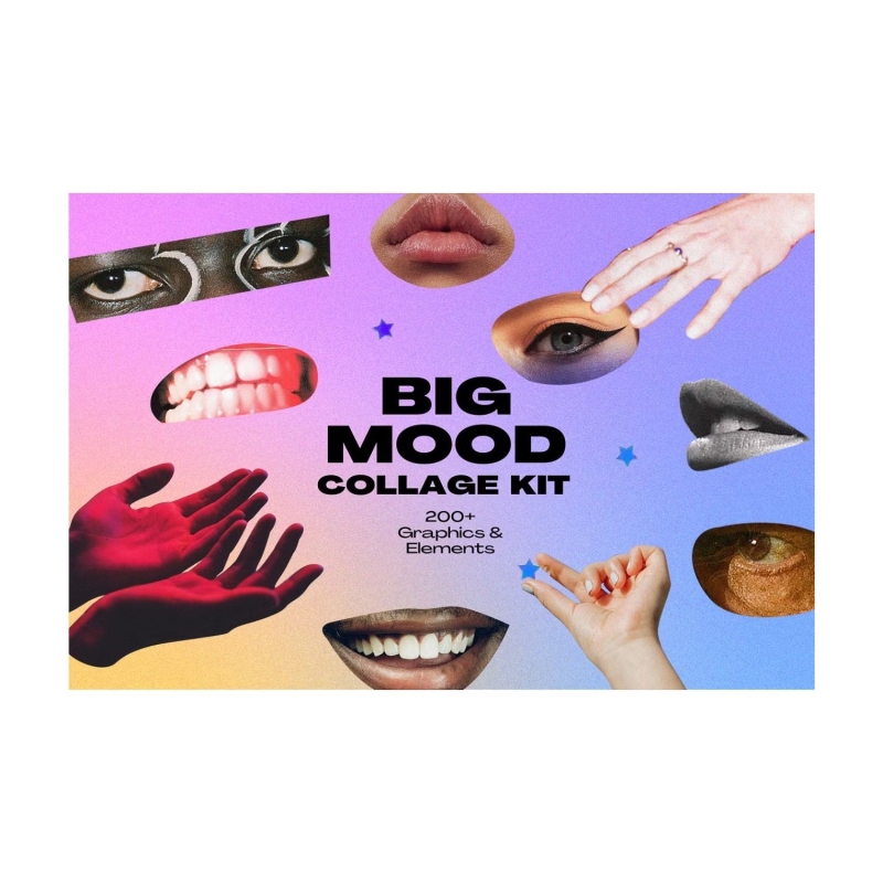 تتميز مجموعة Big Mood collage بأكثر من 200 قص لليدين والعينين والفم. يمكن استخدامها لإضافة نكهة إضافية جريئة إلى مجموعة متنوعة من التصاميم والفن والبضائع. يتضمن أيضا عناصر مجمعة مخصصة مصنوعة يدويا مثل ضربات فرشاة الطلاء وقصاصات الورق الملونة.