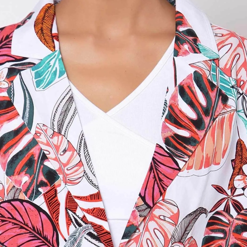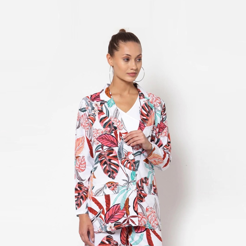 بليزر أبيض مطبوع بالورود بصدر واحد، بياقة طية صدر مسننة، أكمام قصيرة